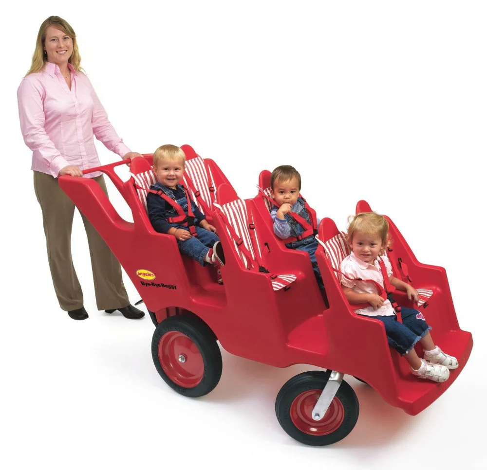 The Original Bye Bye Buggy 4-Seater Stroller features terraced seating so all children can see, 360-degree pivoting front wheels for easy maneuvering, spoke-less steel wheels, easy-to-fasten seat belts, and a built-in storage compartment. The slim design allows the Bye Bye Buggy to fit through doorways. Ships fully assembled.
